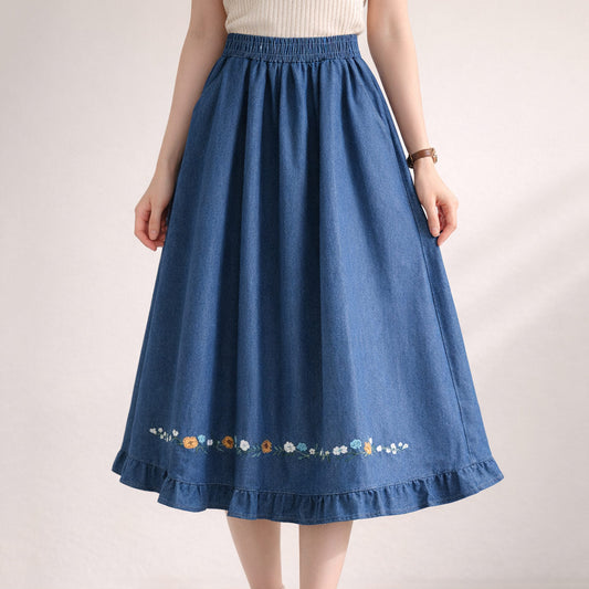 Floral Embroidered Denim Midi Skirt SE23948