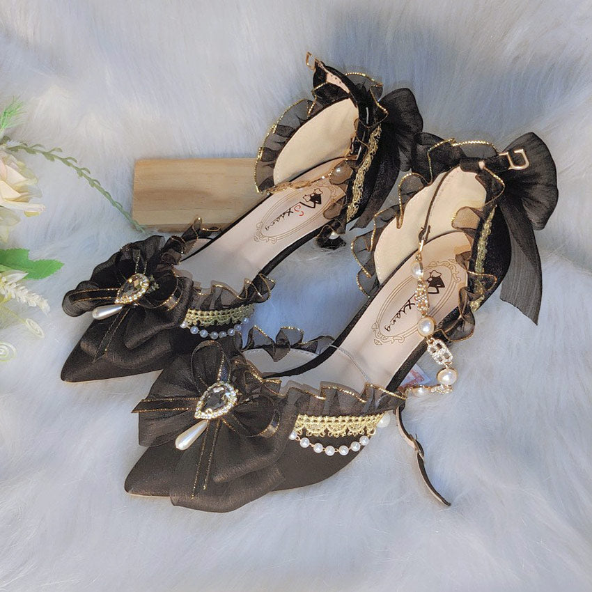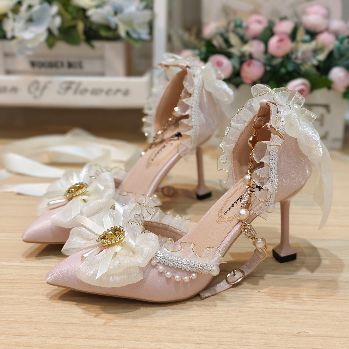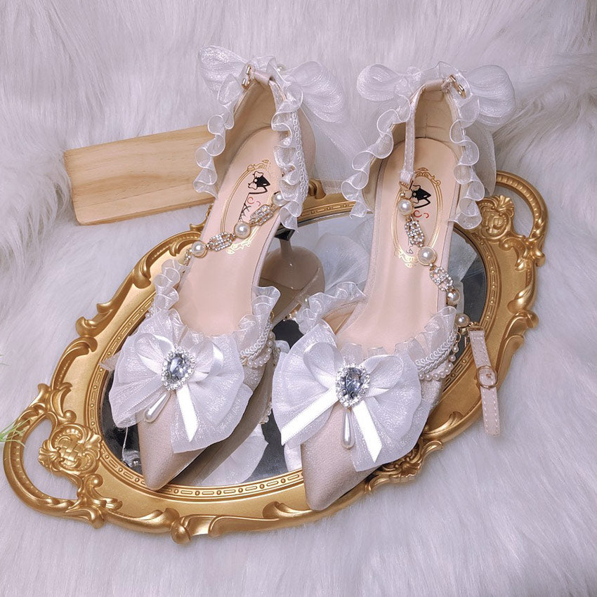 Red Lace Ribbon Heels with Pearls Bridal Shoes SE23560